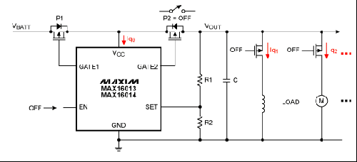 图9.MAX16013/MAX16014用作主开关控制,在ECU关闭时有助于降低静态电流损耗。