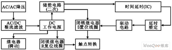 断电延时继电器整体构成包括断电延时继电器电源部分(经降压、整流、滤波)以提供断电延时继电器内置瞬动电磁继电器和2绕组闭锁型R复位线圈工作);二次电源部分(供断电后延时部分与2绕组闭锁型S置位线圈工作);延时工作部分(可编程定时集成或CMOS计数分频集成);驱动部分;执行继电器部分组成(图1)。