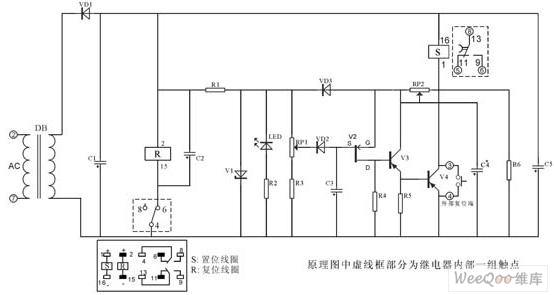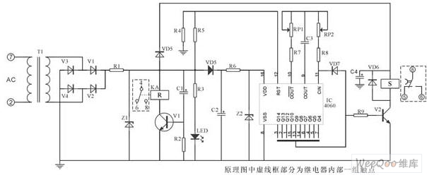 该电路核心部分由IC4541构成,延时设定由RP2、C*设定,A-B端根据需求接相应高、低电平(设定端)内部2绕组闭锁继电器采用DC12V(因继电器工作电压与IC4060组成延时电器要低,则为保证其驱动则分别由V6、V7、V1、V3构成)。其中C2为二次储能器件,可根据延时的长短予以调整,C4为完成S置位线圈工作。