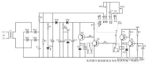 当工作电源断电时,则进入相应的断电延时工作状态。IC○12引脚因C1放电在R3产生一个电平经R4加至○12引脚清零引脚清零,使其延时开始,延时时间经Q4~Q14(根据需求延时时间)来驱动V2工作,待延时到达后经VD7使其振荡停止。根据延时情况,对C2电容可进行相应的增大或减小(通过并联来完成C2的容量的增大或减小)C4电容来完成S置位线圈的工作。