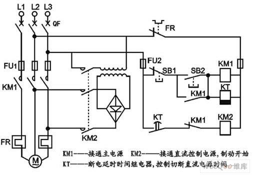 制动过程:按下停止按钮SB1→KM1断电,KM1主触点断开,电机脱离电源,KM1辅助常闭触点恢复闭合,KM2通电,接入直流电源,制动开始,同时KM1辅助??サ阌只指炊峡?,则KT线圈呈断电状态,延时开始,待所设延时时间到达后,KT的延时断开常开触点恢复断开,KM2失电,切断直流电源,制动结束。