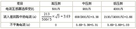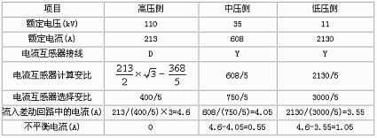 实例:一台三相三绕组降压变压器,容量Se=40.5MVA,电压110±2×2.5%kV/385±2×2.5%kV/11kV,接线方式:Ydd11-11,变压器额定电流:213A/608A/2130A。主变差动?;げ捎肂CH-2型差动继电器?;炯扑闳绫?所示,已确定110kV侧为基本侧。