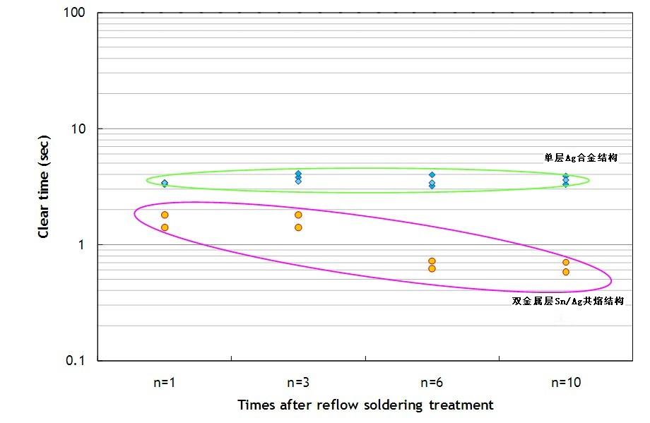 单层Ag合金结构的保险丝即使经过多次高温热处理,仍可以维持较稳定的熔断时间。但是双层Sn/Ag共熔结构的保险丝,其熔断时间有明显变快的趋势。