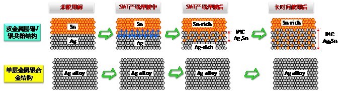 图7 单金属层Ag合金结构与双金属层Sn/Ag共熔结构,在SMT焊接前后及长时间使用后的材料与结构变化示意图。