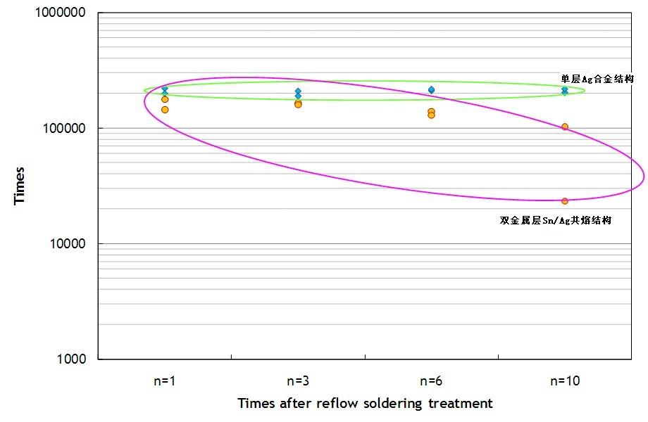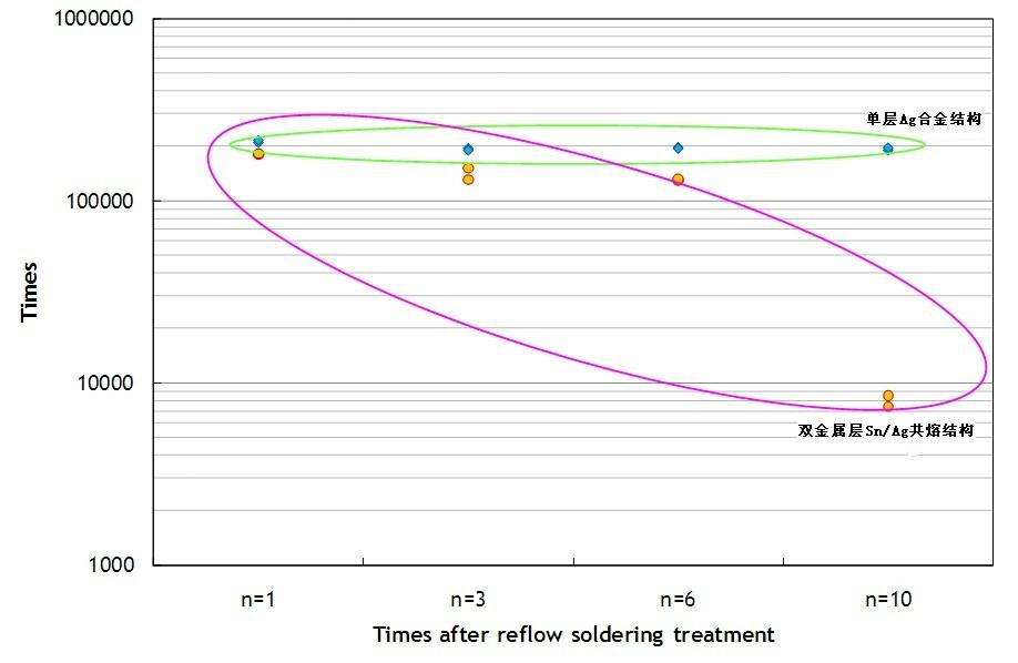 单层Ag合金结构的保险丝即使经过多次高温热处理,仍可以维持一定的耐脉冲能力,承受脉冲次数都可达十万次以上。但是双层Sn/Ag共熔结构的保险丝,其承受脉冲能力有明显下降的趋势,在经过10次回流焊锡炉热处理后,承受脉冲次数就会下降到十万次以下。