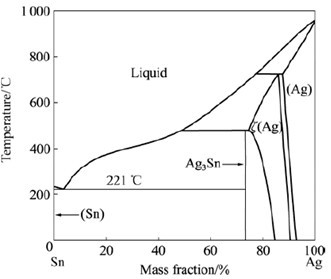 在Sn-Ag二元相图上(图1),仅存在两种Sn-Ag中间金属化合物(IMC),一是Ag4Sn (ζ相),另一个是Ag3Sn(ε相)。 在过去一些学者如Sen等[2]发现在气相沉积Sn/Ag偶在室温条件下形成Ag3Sn IMC; 另外Arai等[3]发现在电镀共沉积Sn-Ag合金中也只形成Ag3Sn金属化合物。