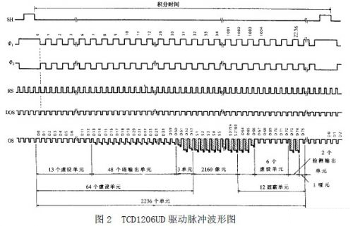 在1MHz 数据率情况下工作时,有效像元输出时间为2.16ms,钢丝绳直径信号产生于2.16ms 期间。输出信号的暗电平可控制在1.0V 左右。而高电平可接近10V,相差比较大。当光学系统调整得比较好时,图像边缘的信号比较陡,测量误差较小。TCD1206UD 的工作原理和驱动电路如下:
