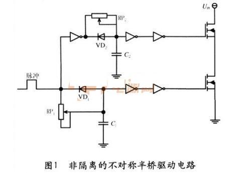 图1为常用的小功率驱动电路,简单可靠成本低,适用于不要求隔离的小功率开关设备。其中一路直接接到下管,另外一路经反向器反向后驱动上管。RP1,RP2用于调节死区时间。