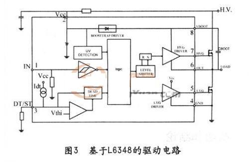 ST公司的L6384是专门的不对称半桥驱动芯片,其原理图及外围电路如图3所示。单脉冲从1脚(IN)输入,5脚(HVG)和7脚(LVG)输出互补的脉冲。3脚(DT/ST)外接电阻和电容来控制两路输出的死区时间。当3脚的电平低于0.5V的时候,芯片停止工作。专用芯片具有外围电路简单、占用空间小的特点,但由于其成本较高,不适用于低成本设计的产品