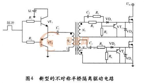 该电路实现了隔离,且能输出较好的驱动波形。但是也存在一些不足之处:①结构复杂,需要双电源供电(±12V);②元器件较多,特别是需要两个隔离变压器,不仅占用较大空间,而且增加电路成本。