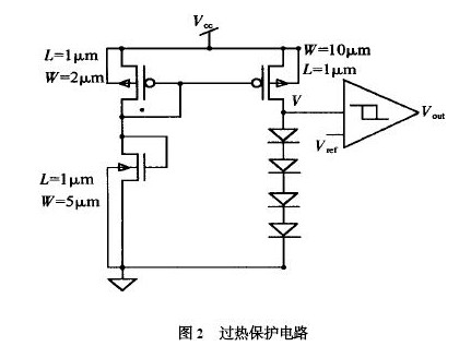 介绍了一种利用串连二极管构成的过热保护电路的电路结构,工作原理,及参数调节的要点,也简要提及了版图的绘制。该过热保护电路结构简单、原理清晰、性能可靠,适用于功率集成电路。