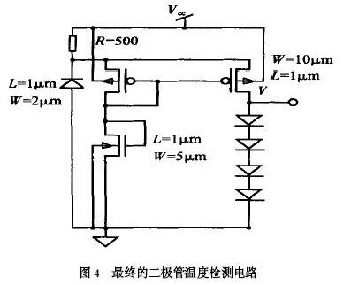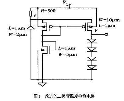 假设在总电路中标准的参考电压为2. 0 V。则二极管温度检测电路的参数要调节到( V T + + V T - ) / 2= 2. 0 V。调节的方法很多,3 个用作镜像电流源的MOS管的尺寸可以很方便的调节,MOS 管尺寸改变则流过二极管的电流就会改变,从而引起上下跳变点电压的改变。甚至还可以调节二极管,比如去掉1 个二极管,就用3 个二极管来做温度检测。如图3 所示的尺寸时,50 ℃时为2. 16 V ,120 ℃时为1. 535 V ,即V T + = 1. 535 V , V T - = 2. 16 V。则( V T + + V T - ) / 2= 1. 85 V ,不到2. 0 V。最方便的调节方法就是放大二极管前面1 个NMOS 管的尺寸。尺寸越大则跳变点电压就越高。当然也可以调节另外的2 个MOS 管的尺寸。总之要使得( V T + + V T - ) / 2 = 2. 0 V?! ?br />