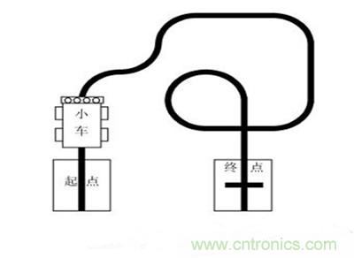 所谓小车循迹,就是在白纸上画出黑色的线条,称为赛道;小车沿着赛道按要求(可以做一些指定的任务)行进时,能自动识别赛道并按赛道线条行走,称为小车循迹。如图1所示,该赛道是2010年全国职业院校大学生职业技能竞赛月球车竞赛项目湖南赛区赛道图。