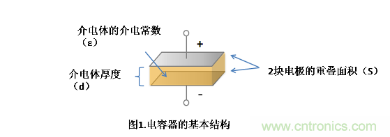 电容器用于储存电荷,其最基本结构如图1所示,在2块电极板中间夹着介电体。