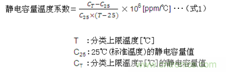 (1)一种是在公共标准中被归类于种类Ⅰ (Class1)的温度补偿用独石陶瓷电容器中,使用了二氧化钛与锆酸钙类电介质材料,其静电容量对温度几乎呈现直线性变化。将温度发生的变化称为温度系 数,其数值以每1℃的百万分之一作为单位(ppm/℃)表示。温度系数根据基准温度(IEC,JIS标准中为20℃,EIA标准中为25℃,此处以25℃ 为基准)中的静电容量值C25与分类上限温度(最高使用温度:设计上可连续使用电容器的最高环境温度)中的静电容量值CT定义得出。