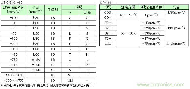 表1:温度补偿用独石陶瓷电容器的温度系数值和公差以及其标记
