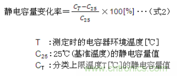 (2) 另一种是在公共标准中被归类于Class2(种类2)的高介电常数独石陶瓷电容器,使用了钛酸钡系的介电质材料,其静电容量值对温度呈现出不规则的变化。 因此,静电容量-温度特性的标准值是针对基准温度(此处以25℃为基准)的静电容量值C25,通过适用温度范围内的静电容量变化率的最大值与最小值进行规 定。(参照式2)。