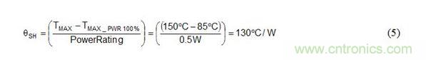 另外,电阻器也不可能在 100% 额定耗散 (TMAX_PWR100%)、85°C 下工作。您可通过该温度、最大工作温度以及电阻器的功率额定值计算出针对 θSH 的值,如图 5 所示。