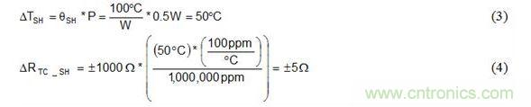 公式 3 可计算功率耗散所引起的电阻器温度增加量 ΔTSH。公式 4 将 ΔTSH 插入公式 1 替代 ΔT,以确定 100°C/W 适度自发热和 0.5W 功率耗散情况下自发热所引起的电阻变化。