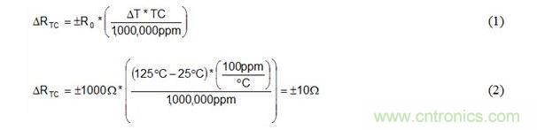 公式 1 和 公式 2 是温度从 25°C 到 125°C 变化时,如何使用电阻器 TC 规范计算 1kΩ、±100ppm/°C 电阻器阻值 ΔRTC 变化的实例。