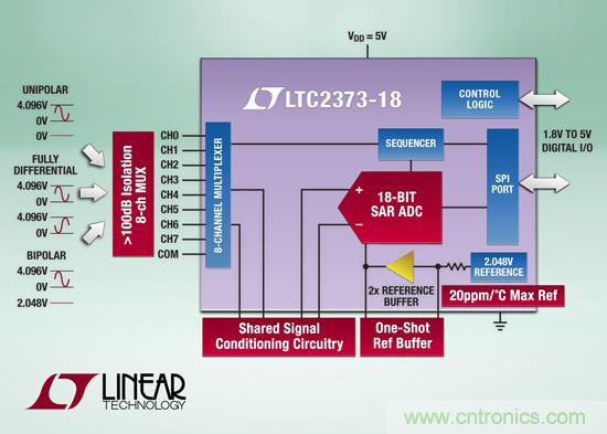 【导读】近日,凌力尔特公司宣布推出具排序器的 18 位、1Msps、8 通道的逐次逼近寄存器 ADC LTC2373-18,该器件拥有卓越的 100dB SNR 性能。LTC2373-18 具可编程排序器,可存储多达 16 个控制字,以配置多工器 (MUX) 和输入范围。