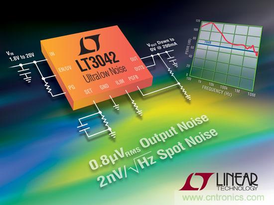 【导读】近日,凌力尔特公司推出领先的具备超低噪声、超高电源纹波抑制的低压差电压线性调节器 LT3042。该器件的优势在于具有仅为 2nV/√Hz (在 10kHz) 的超低点噪声和 0.8µVRMS 的积分输出噪声 (在 10Hz 至 100kHz 的宽带宽内)。该器件低频和高频 PSRR 性能使其占有巨大的优势。低频 PSRR 超过 90dB (直到 10kHz),而高频 PSRR 则超过 75dB (直到 3MHz),可使噪声或高纹波输入电源变得 “安静”。