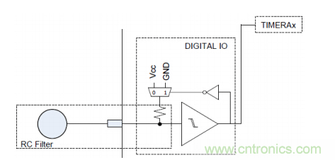 MSP430根据型号的不同支持多种电容触摸检测方式,有RC 震荡、比较器、PIN RO,本设计使用的是PIN Relaxation Oscillator 方式,原理如图,芯片管脚内部检测电路由施密特触发器、反向器,以及一个电阻组成,震荡信号经过施密特触发器变成脉冲信号,再通过反向器反馈回RC 电路,通过Timer_A对施密特触发器的输出进行记数,再通过设置测量窗口Gate 获得记数的结果。当手指触摸电极,电极上的C 产生变化,导致震荡频率改变,这样在定长的测量窗口就能获得不同的记数结果,一旦差值超过门限,结合一定的滤波算法判断就可以触发触摸事件。