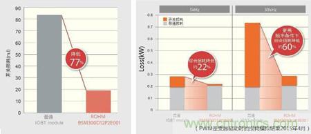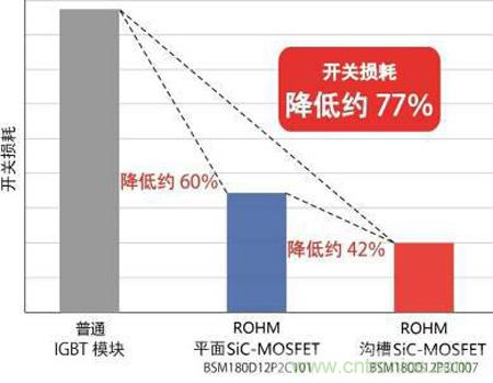 ROHM首先实现了采用量产中的沟槽结构SiC-MOSFET元件的“全SiC”功率??榈牟坊?。该产品的额定电压为1200V,额定电流为180A,内部电路为半桥配置。与同等额定水平的Si-IGBT功率模块产品相比,其显著优势当然不必言说,即使与量产中的1200V/180A的SiC-MOSFET??橄啾?,其开关损耗也大幅降低(图7)。