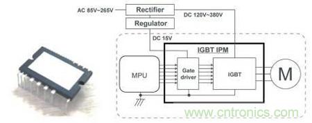 为降低功耗,众多电机应用中均实现了设备的变频化。这些变频设备中广为采用的产品是将IGBT功率元件、控制它们的IC以及外围电路1体化封装的功率??椴罚↖PM:智能功率模块)。ROHM的IGBT-IPM产品搭载自产的硅材质IGBT元器件,并已投入量产(图8)。