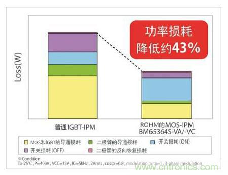 图9. 普通IGBT-IPM与ROHM的MOS-IPM的损耗比较