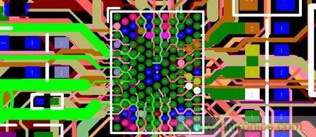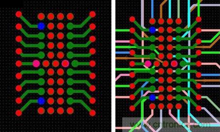 图6所示的扇出方法避免了使用高端技术,而且不影响信号完整性。BGA引脚被分成内部和外部引脚两个部分。焊盘内过孔用于内部,外部引脚在0.5mm栅格上扇出。图7a显示的是顶层,图7b显示的是顶层和内部布线层。