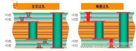 推荐使用深度最多6层的盲孔/埋孔配置。层数再多会引起制造良率问题。优选技术是使用交叉过孔或堆叠过孔,如图8所示。交叉过孔允许更加精确的注册公差,因为它们不像堆叠过孔那样强制要求完美对齐。