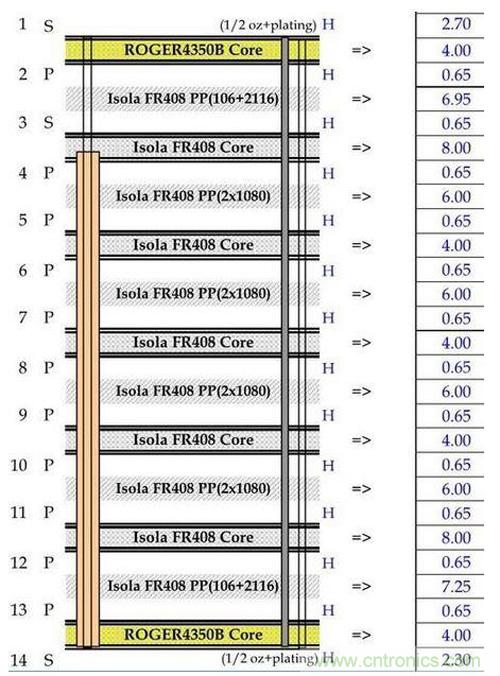 图1:多层电路板的叠层图,图中展示了FR4材料和Rogers 4350以及核心层厚度。