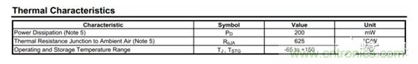 从中可知,其耗散功率PD=200mW,热阻为625℃/W,其中这两个量是环境温度25℃,焊在FR-4材质 PCB条件下测试的,如手册说明Part mounted on FR-4 PC board with recommended layout 。