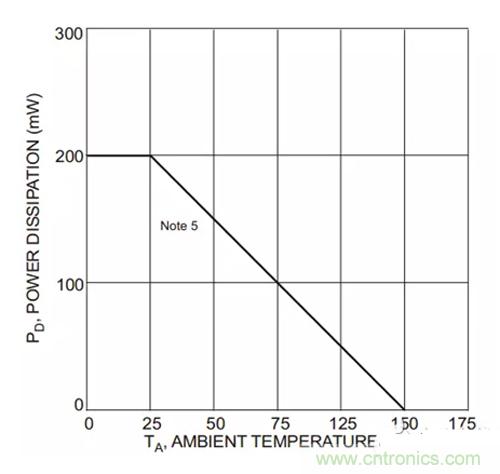 在0~25℃是,耗散功率恒为200mW,在25~150℃时,线性递减,到达150℃,耗散功率为0,在这个温度,硅管已经不能工作了。从这个表中,可以计算出热阻,其线性部分斜率倒数: