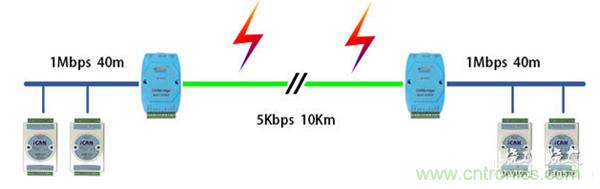 传导防护主要是在传输线上进行的。CAN总线的数据传输介质一般为双绞线,它主要的作用是抗低共模干扰,但是在面对浪涌、雷击等情况时不仅没有防护作用,反而易造成节点设备的损坏。因此,具备室外环境、长传输距离、多节点设备特点的总线一般都要加隔离防护功能的网桥、中继器,如图8。当用户的CAN总线受到强干扰导致死机或者损坏,接上该系列产品后,可以隔离干扰?;ど璞刚T诵?。优秀的网桥及中继器具有2500VDC、±8KV静电等级的防护能力。