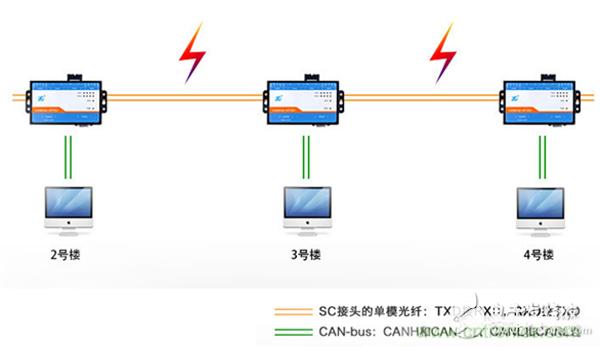 有没有方法能彻底解决雷击造成的隐患呢?答案是肯定的,只要数据的传输不依赖电信号就能完全隔离掉雷击的危害。我们可以把CAN总线室外的部分或者说容易受到干扰的部分使用光信号传输,这种方法目前已经广泛应用于高速铁路、地铁、煤矿、医疗、航空航天、楼宇安防、电梯控制等场合。