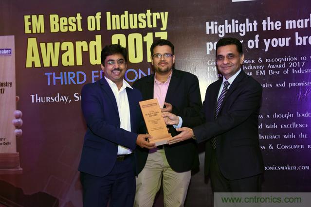 图片说明:印度销售经理Bharat Kapoor(左)以及印度和南非现场应用经理Navneet Vinaik(中)接受EM行业最佳奖的“最佳电路?;ぷ榧?/font>”。