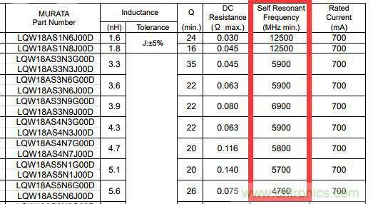 C0G/NP0类的低损耗电容和高Q值RF绕线电感datasheet中一般都会主动标出自谐振频率的具体值和测试方法。简单地说,电容在低于自谐振频率的区间内才有作为容性元件的利用价值,电感在自谐振频率内才有作为电感的利用价值。