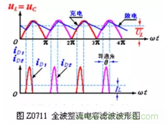 全波或桥式整流电容滤波的原理与半波整波电容滤波基本相同,滤波波形如图Z0711 所示。