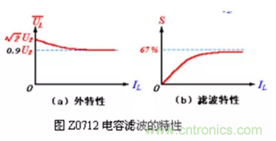 4. 电容滤波电路的外特性(指UL与IL之间的关系)和脉动特性(指S与IL 之间的关系)比较差,如图Z0712 所示??梢钥闯鍪涑龅缪筓L和脉动系数S随着输出电流IL 的变化而变化。当IL=0(即RL= ∞ )时,UL = U2(电容充电到最大值后不再放电),S = 0。当IL增大(即RL减小)时,由于电容放电程度加快而使UL下降,UL 的变化范围在 U2 ~0.9 U2之间(指全波或桥式),S变大。所以,电容滤波一般适用于负载电流变化不大的场合。