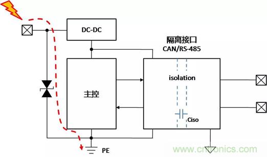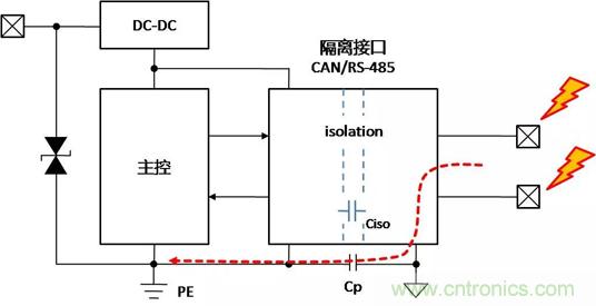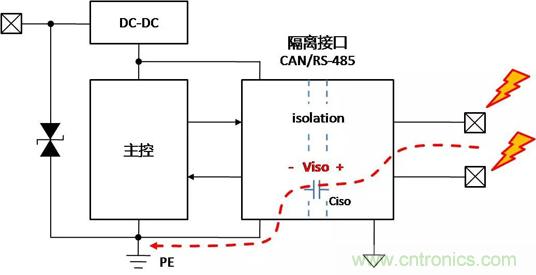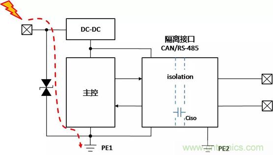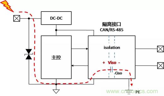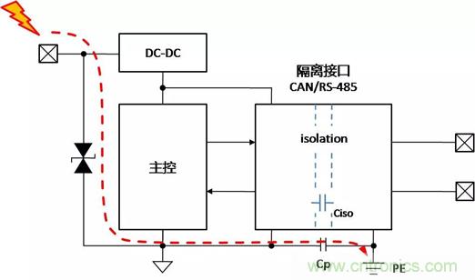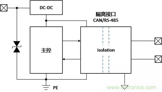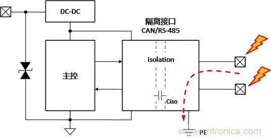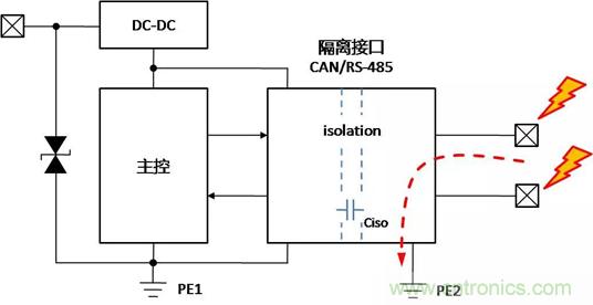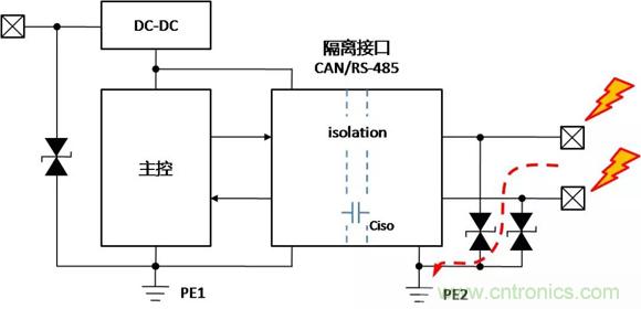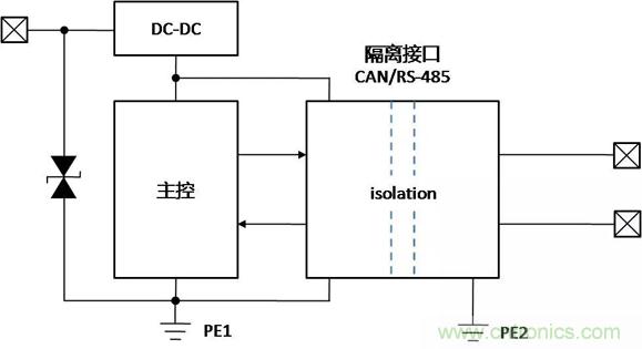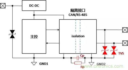 带隔离通信接口的设备,在不同的使用、安装状态下,接口会表现出完全不同的ESD特性,了解设备在不同的使用状态下,ESD对接口的影响的机理,才能有针对性地增加?;て骷?,提升隔离接口的ESD能力。下面以带有隔离CAN或RS-485通信接口为例,对常见的设备状态下,ESD的作用机理进行分析,并提出相应的改善措施。
