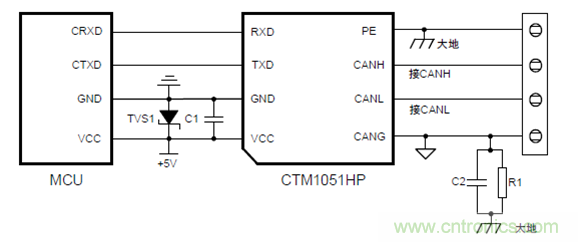 由于设备实际应用中会存在各种不同的状态,对于与上述描述不同的情况,也可按以上的方法进行分析,并有针对性的增加?;て骷?,从而达到提升ESD抗扰能力的作用。广州致远电子有限公司基于多年的总线防护设计积累推出了高防护等级隔离???mdash;—CTM1051(A)HP系列。该系列符合国际ISO11898-2标准,静电防护等级可达接触±8kV,空气放电±15kV,浪涌防护可达±4kV隔离CAN解决方案,具体如下图15所示,能够适用于各种恶劣的工业现场环境。应用简便,即插即用,应用原理图如下图16所示。
