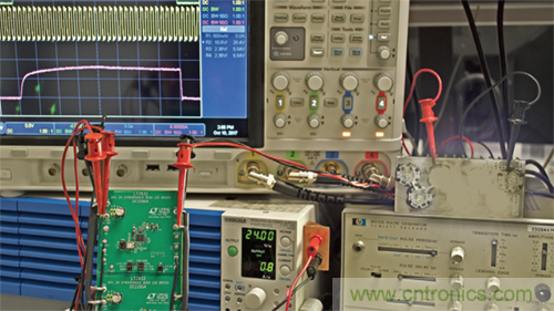 LT3932演示电路(DC2286A)设计为通过一个或两个LED(作为降压LED驱动器)驱动1 A的LED电流。如图1所示,它很容易进行更改和并联,以实现更高电流、更高电压或并联运行。图4显示了如何将两个这样的电路轻松连接在一起,从24 V输入以10μs、3 A脉冲驱动4个LED。出于测试目的,脉冲发生器可用于提供同步时钟信号,如图4所示。在量产机器视觉系统中,可利用时钟芯片生成同步时钟信号和PWM脉冲。如需更高电流脉冲,可使用相同的并联方案添加更多演示电路DC2286A转换器。