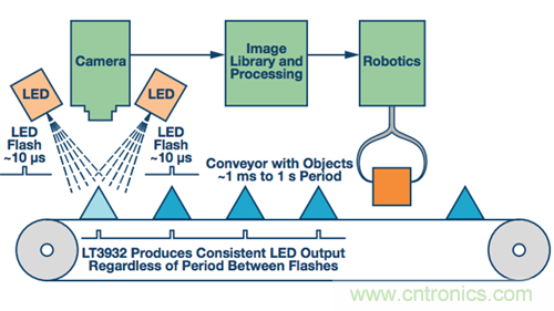 幸运的是,LT3932高速LED驱动器可为高达2 A的LED串提供机器视觉相机闪光灯,关断时间可以长达1秒、1小时、1天或更长时间。LT3932的特殊相机闪光灯功能允许其保持输出电容和控制环路充电状态,哪怕是在长关断时间内。对输出和控制环路电容的状态进行采样后,LT3932继续在长关断期间对这些元件进行涓流充电,以补偿通常都会有的漏电流,而这是其他LED驱动器未予考虑的。