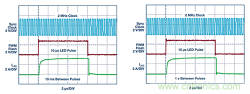 图2. 无论PWM关断时间是多少,图1所示并联LED驱动器的3 A相机闪光波形看起来相同。波形显示,(a) 10 ms之后和(b) 1 s之后的10μs脉冲是相同的。经过一天或更长的PWM关断时间之后,LT3932 LED闪光波形看起来也相同。