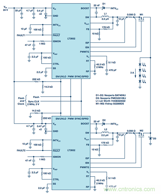 LT3932的专有闪光技术可以扩展,驱动器可以并联以提供更高的LED闪光电流。所需的闪光形状和完整性保持不变。图1显示了并联两个驱动器以支持3 A相机闪光灯是多么容易,高达4 A的设计也是可行的。