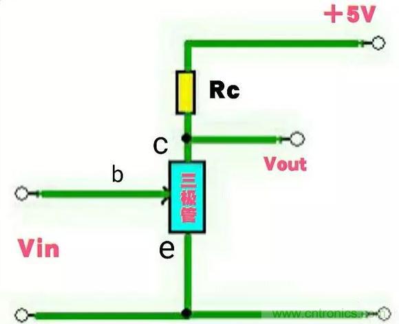 上图中,三极管的c-e两极之间可以视为一个可变电阻,这个电阻的大小受输入信号控制,并与输入信号呈良好的线性关系。当输入电压Vin增大时,三极管的c-e两极之间的电阻减小,集电极电流Ic增大,使电阻Rc两端的电压也增大,这样在Rc两端便获得了一个放大了的电压信号。