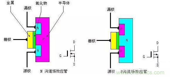 功率MOSFET的内部结构和电气符号如图所示,它可分为 NPN型和PNP型。NPN型通常称为N沟道型,PNP型通常称P沟道型。由图1可看出,对于N沟道型的场效应管其源极和漏极接在N型半导体上,同样对于P 沟道的场效应管其源极和漏极则接在P型半导体上。我们知道一般三极管是由输入的电流控制输出的电流。但对于场效应管,其输出电流是由输入的电压(或称场电压)控制,可以认为输入电流极小或没有输入电流,这使得该器件有很高的输入阻抗,同时这也是我们称之为场效应管的原因。