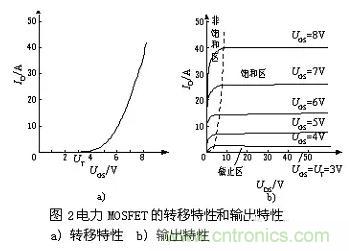 MOSFET的漏极伏安特性(输出特性):截止区(对应于GTR的截止区);饱和区(对应于GTR的放大区);非饱和区(对应于GTR的饱和区)。电力 MOSFET工作在开关状态,即在截止区和非饱和区之间来回转换。电力MOSFET漏源极之间有寄生二极管,漏源极间加反向电压时器件导通。电力 MOSFET的通态电阻具有正温度系数,对器件并联时的均流有利。